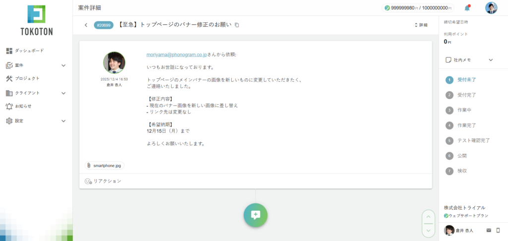 「トコトン」は、小規模案件に特化したプロジェクト管理ツールで、日々の細かい更新依頼の情報を一元化することができます。