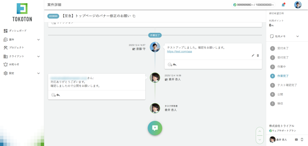 トコトンの強みであるステータス管理やタスク管理、検索性の高さを活用するためにも、制作会社側はトコトンの画面で操作するようにしてください。