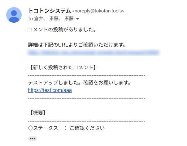 このメールを案件の専用メールアドレスに送信すると、トコトンの案件にコメントとして追加され、以下の情報が記録されます。