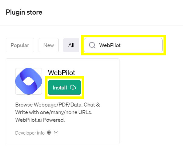 検索窓に「WebPilot」と入力して、「WebPilot」が表示されれば、「Install」をクリックする。