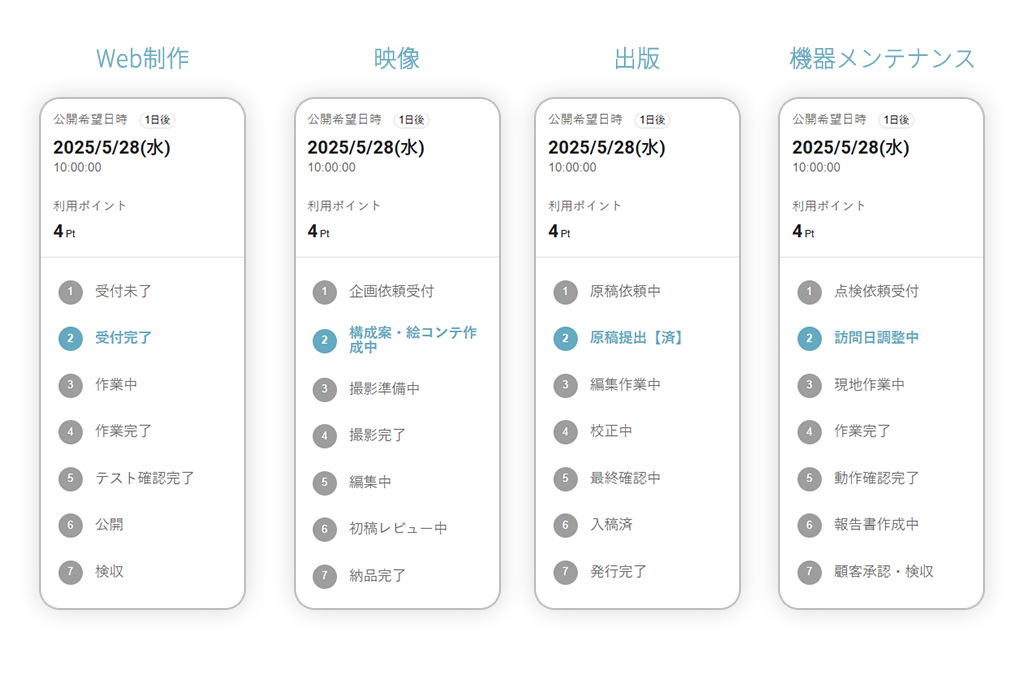 業務の依頼から対応までのプロセスを一元管理し、各ステップの履歴を自動的に記録・保存します。これにより、業務の透明性が向上し、属人化の防止や監査対応の効率化が実現します。
