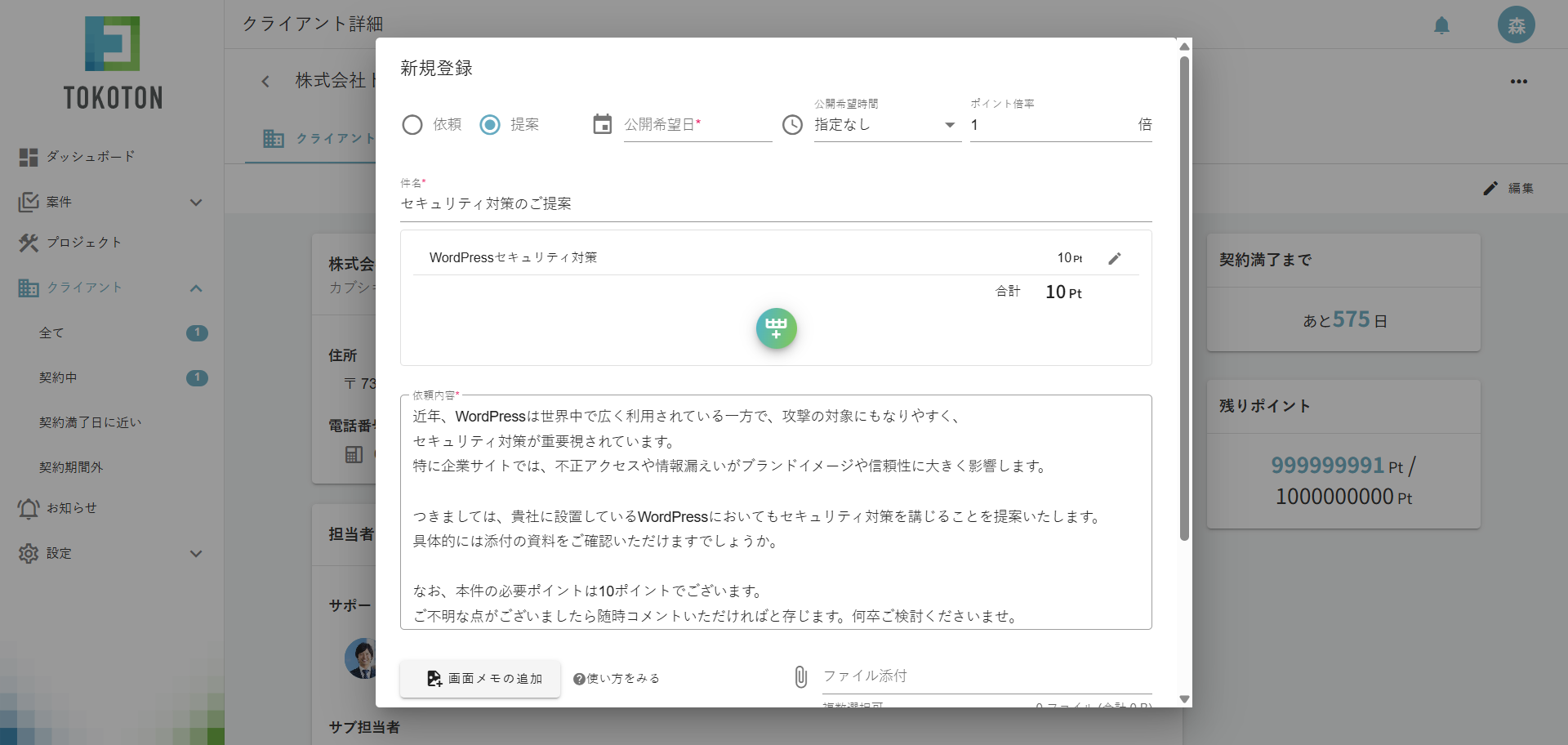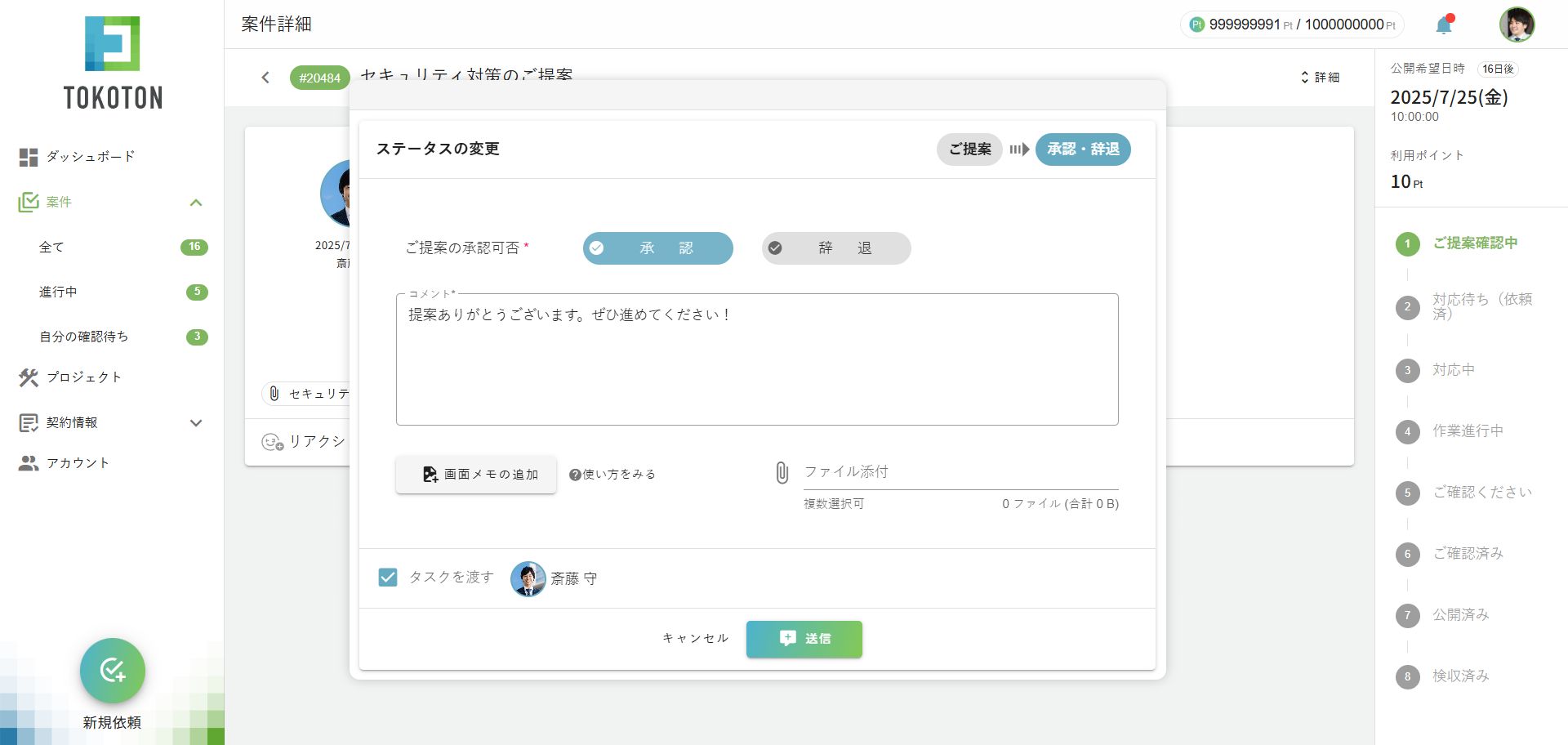 トコトンの提案機能では、改善提案の起案が行えます。クライアント側も「受け入れ」「辞退」を選べるので、納得感のある進め方ができます。