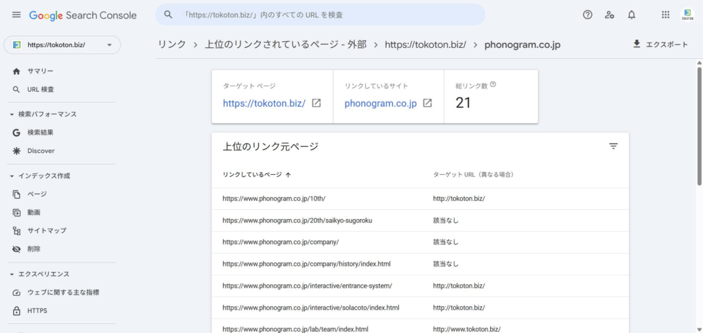 また、「上位のリンク元サイト」では、Googleサーチコンソールのプロパティ外(外部サイト)からリンクされているサイトとそのリンク数を確認できます。