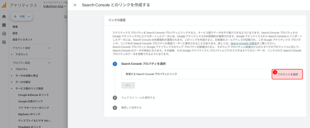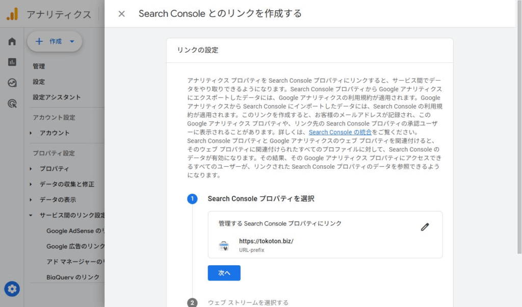 選択したSearch Consoleのプロパティが選ばれていることを確認し、「次へ」をクリックします。
