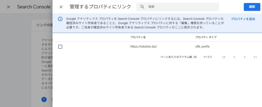 連携するSearch Consoleのプロパティにチェックを入れ、右上の「確認」ボタンをクリックします。