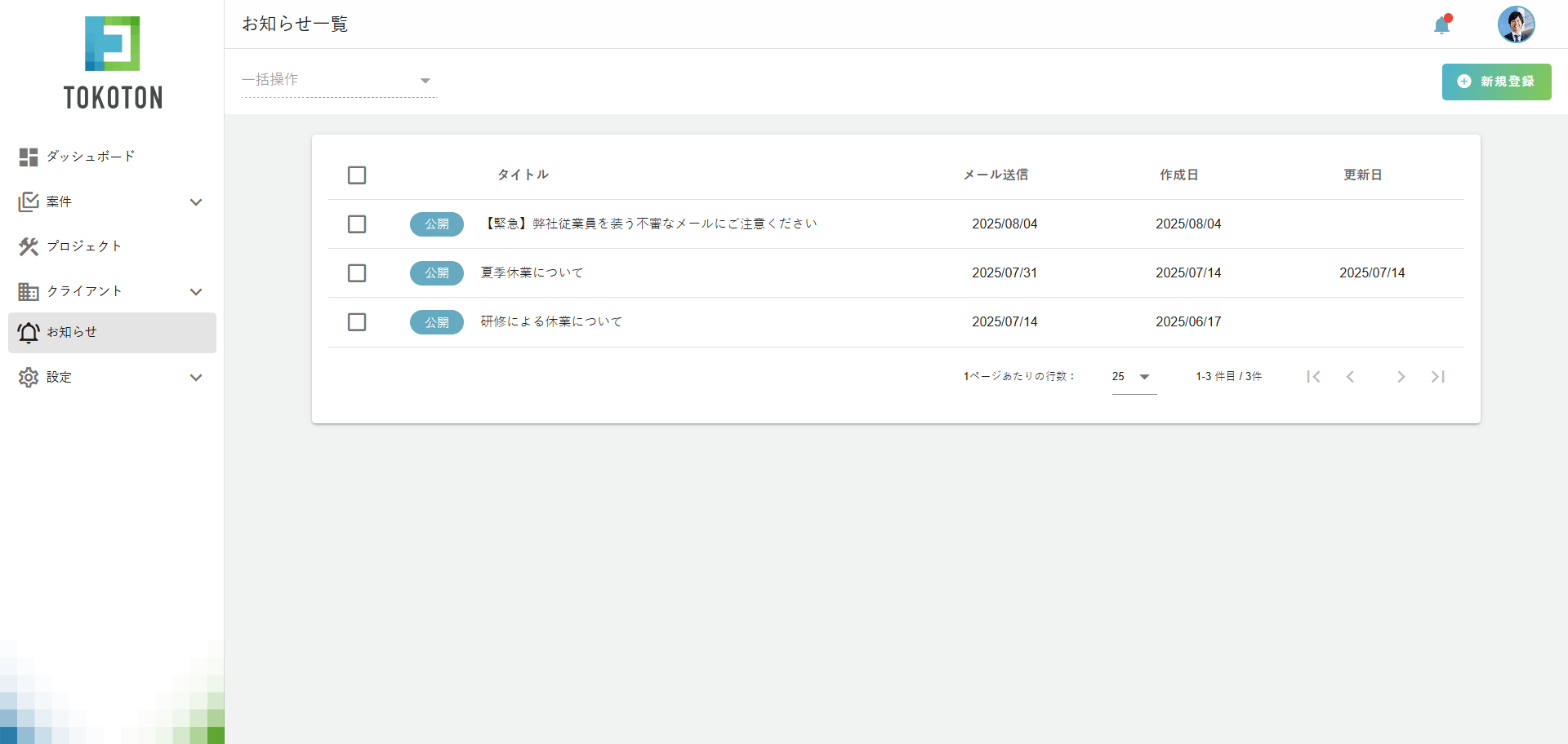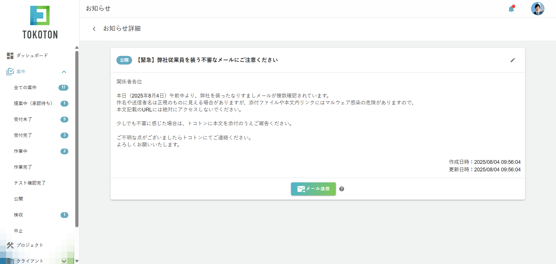 トコトンに登録されている契約中のクライアントの全メールアドレスに対してお知らせを送信することも可能です。