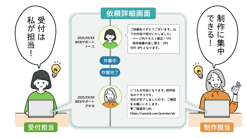 受付と制作を分けて対応でき、作業の手を止めることなく進められます。依頼対応はチームで分担。制作に集中する時間をしっかり確保できます。