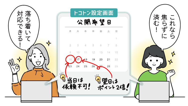 トコトンなら、公開希望日を2営業日以上などに制限できるほか、当日対応にポイント2倍を設定して、依頼側の意識も変えられます。